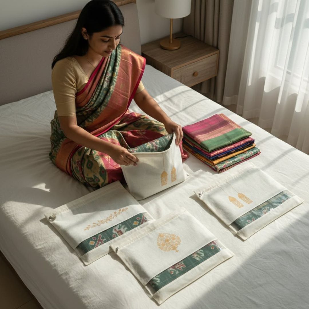 - Convenient Zip Closure: Each saree storage bag comes with a smooth, durable metal zipper for secure and long-lasting use. Color-coordinated stitching adds a premium touch to every cotton saree cover.
